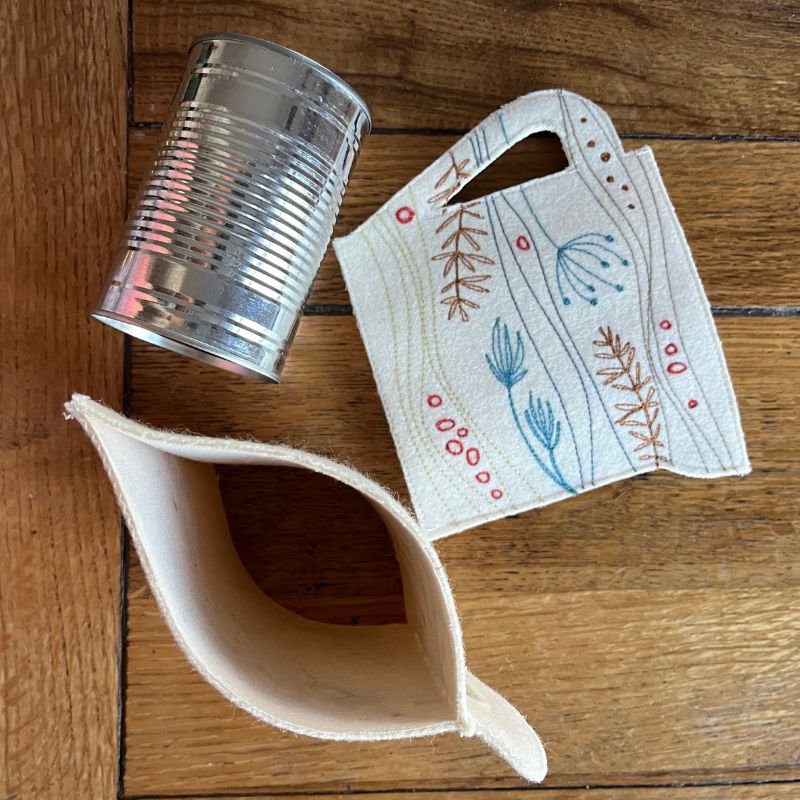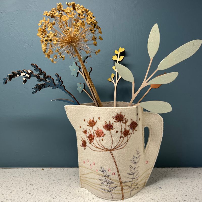 Join me in a short online course, including a template, plus short videos on how to make this fabric jug. It fits snugly over a tin can, creating a vase for fresh or dried flowers, perfect for decorating the house or giving away as presents.
