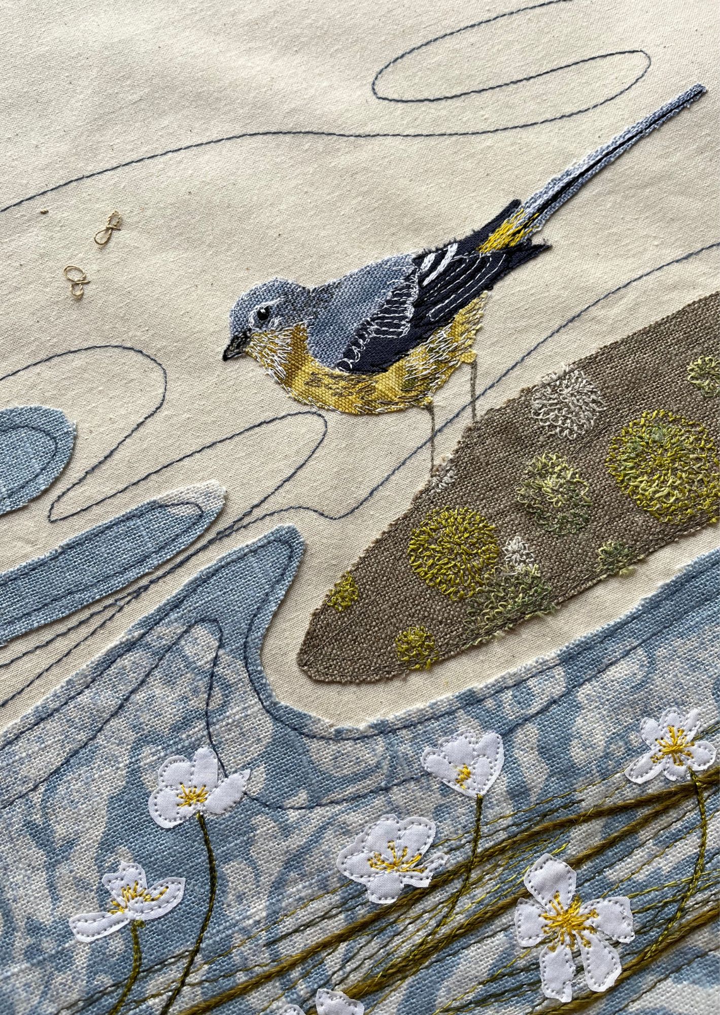 This is the embroidery I film myself making. I show you a few variations of this design using different colours of fabric. Also ideas for creating the lichen on the rock in whip stitch.
