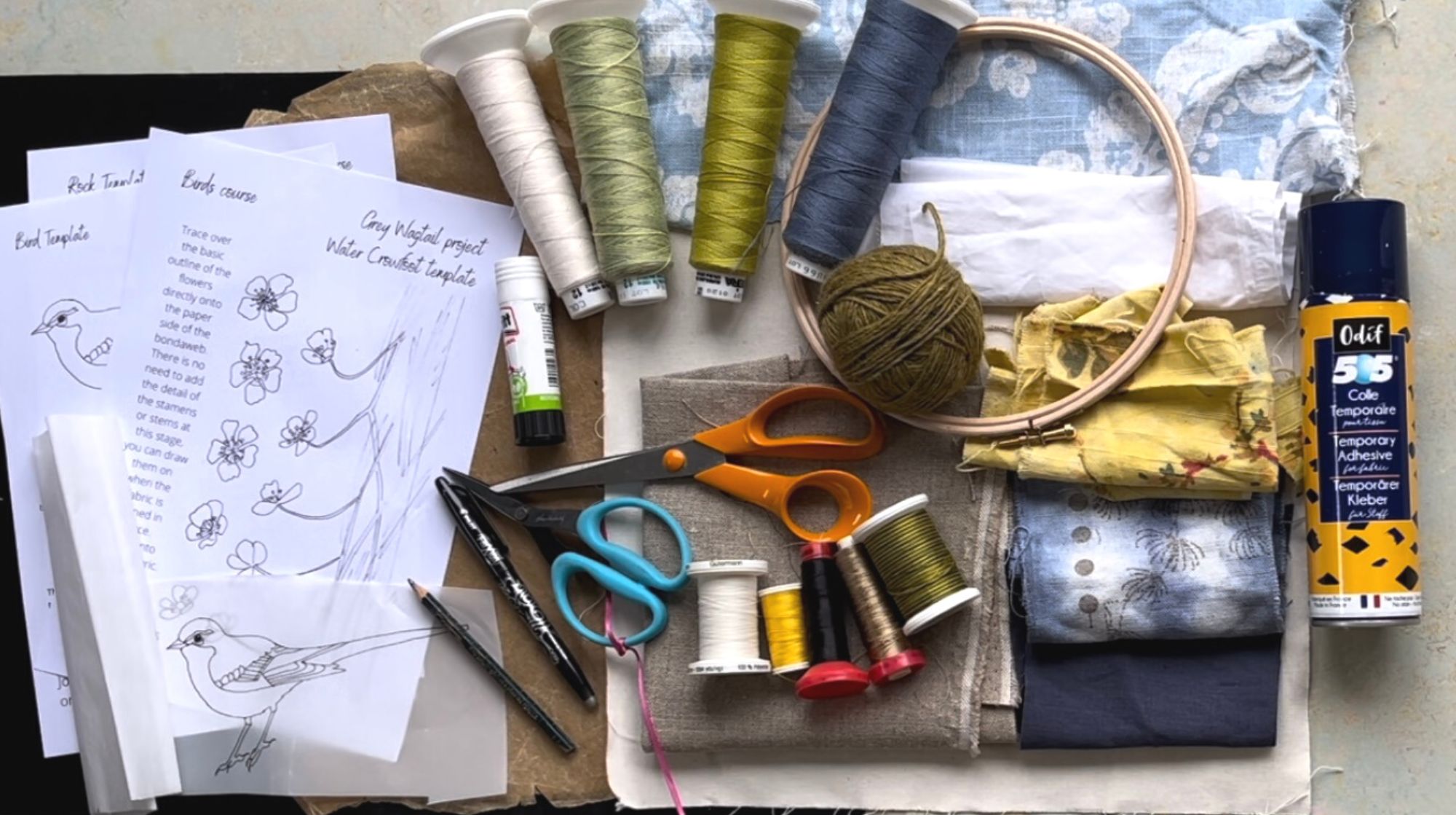There are lots of short videos in bite sized pieces to watch then stitch along to, there are images to inspire you, lots of PDF templates of birds, flowers and backgrounds to download and print out so you can trace my designs accurately. Alternatively put your own twist on it, I give you tips and tricks on stitching and creating your own work.